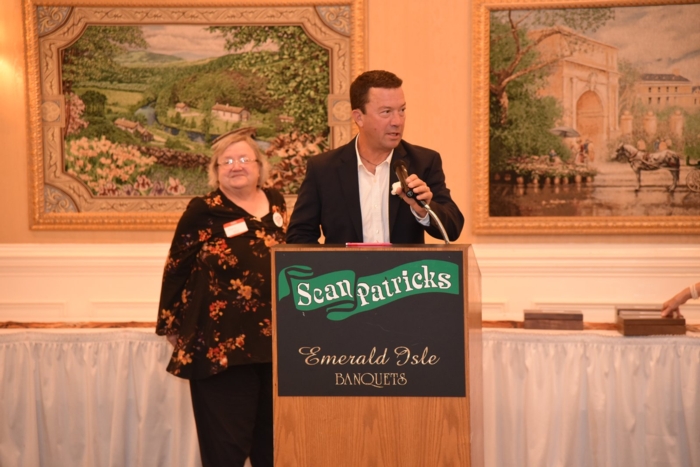 [David Dean '48 – Distinguished Alumni Awardee (Posthumously) Keith Dean (David’s Son) accepting award from Amherst Central Alumni Foundation Board Member Marilyn Rohl.]
